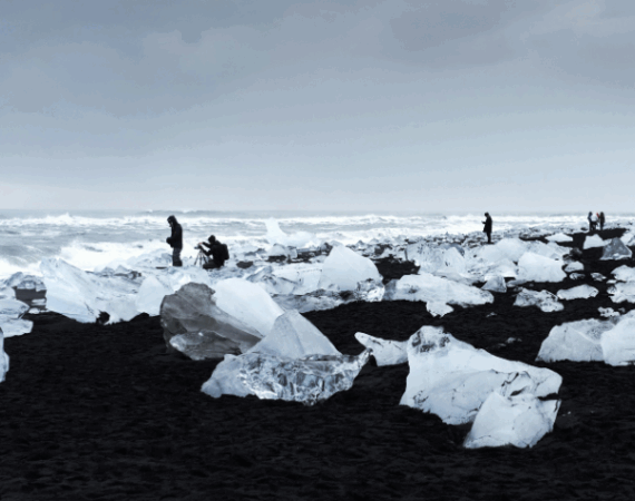 По пути к леднику мы также увидим Мирдальсйёкюдль — дом вулкана Катла, одного из самых непредсказуемых и мощных в стране. И неподалёку — легендарный Эйяфьядлайёкюдль, имя которое запомнили тогда авиапассажиры всего мира после его мощного извержения в 2010 году. Здесь, где огонь и лёд соседствуют веками, Исландия показывает своё истинное лицо. Позже нас ждёт ледниковая лагуна Йёкюльсаурлоун — место, где огромные айсберги отрываются от ледника и тихо дрейфуют в бирюзовых водах. Отсюда всего несколько шагов до пляжа Diamond Beach — берег здесь снова чёрный, но усыпан осколками айсбергов, словно бриллиантами, выброшенными на вулканический песок.