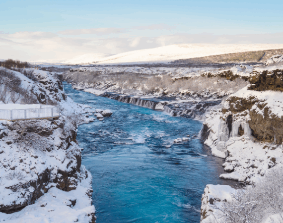 Далее нас ждёт одно из самых поэтичных зрелищ — водопад Хрёйнфоссар. Это не привычный каскад, а широкая водная завеса, где десятки ручейков вырываются прямо из лавового поля, словно прячась от глаз. Всего в нескольких минутах ходьбы — водопад Барнафосс, «детский водопад», окружённый скалами и древней легендой о трагедии двух детей. Вода здесь стремительна, шумна, и кажется, будто она несёт в себе отголоски сказаний.
